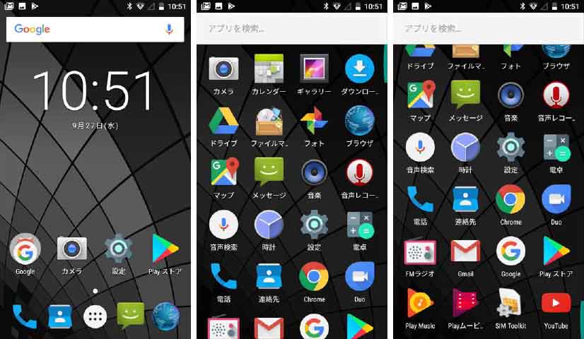 初期状態のホーム画面と、アプリの一覧です。