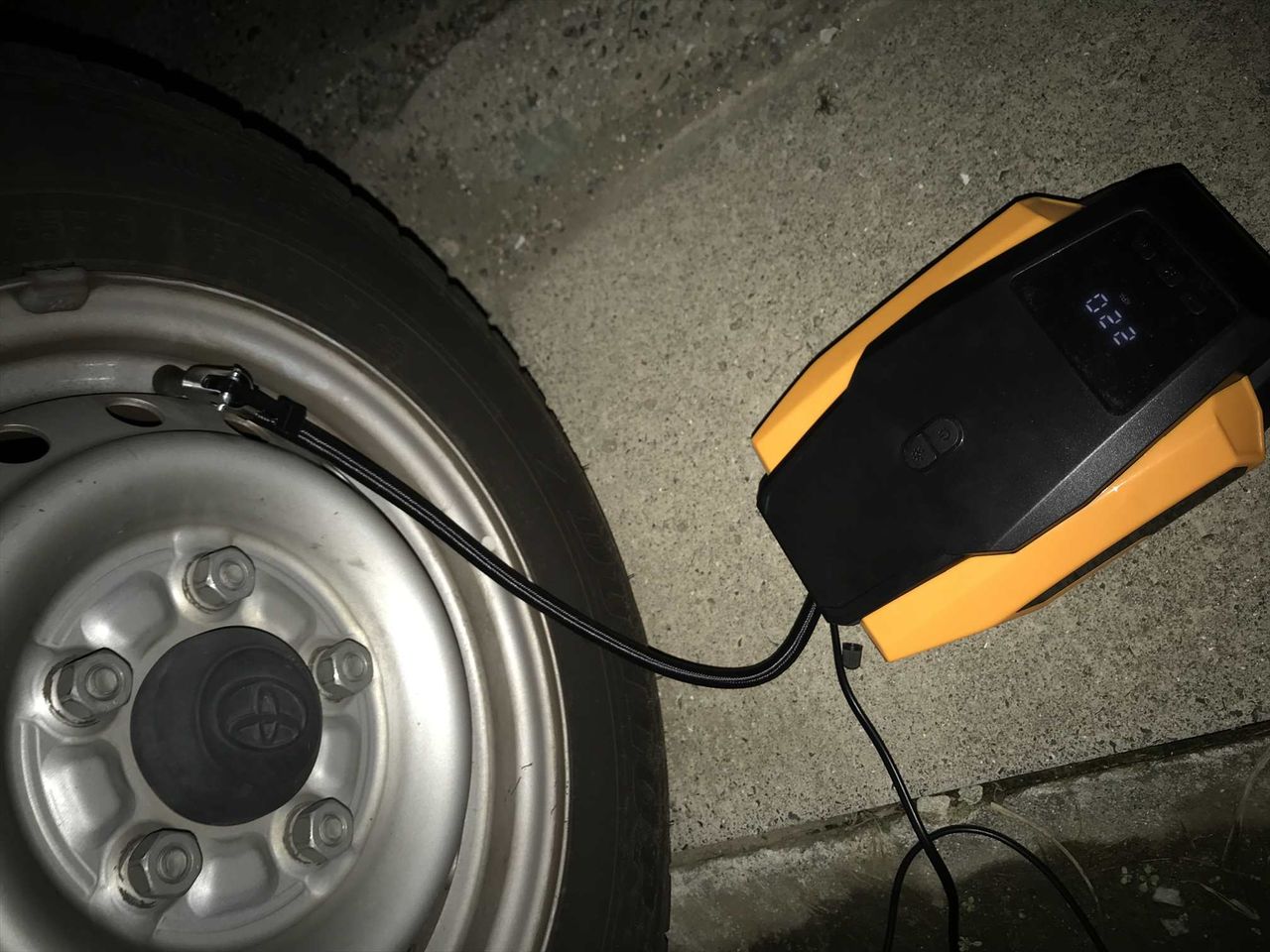電源ケーブルも3.5mあるので、よほど大きい車でない限り、後輪のタイヤの空気の充填問題ないでしょう。