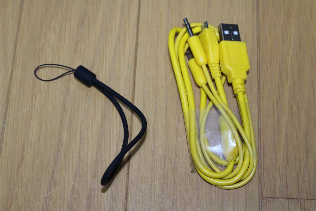 ストラップ、オーディオケーブル、充電用のMicroUSB-USBケーブルが付属しています。