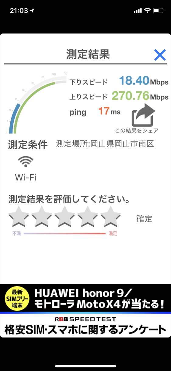 iPhone Xで計測を行いましたが、上りは実に270Mbpsを計測。