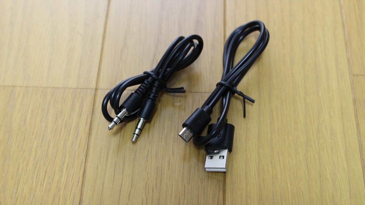 オーディオケーブルと、充電用のMicroUSB-USBケーブルが付属しています。