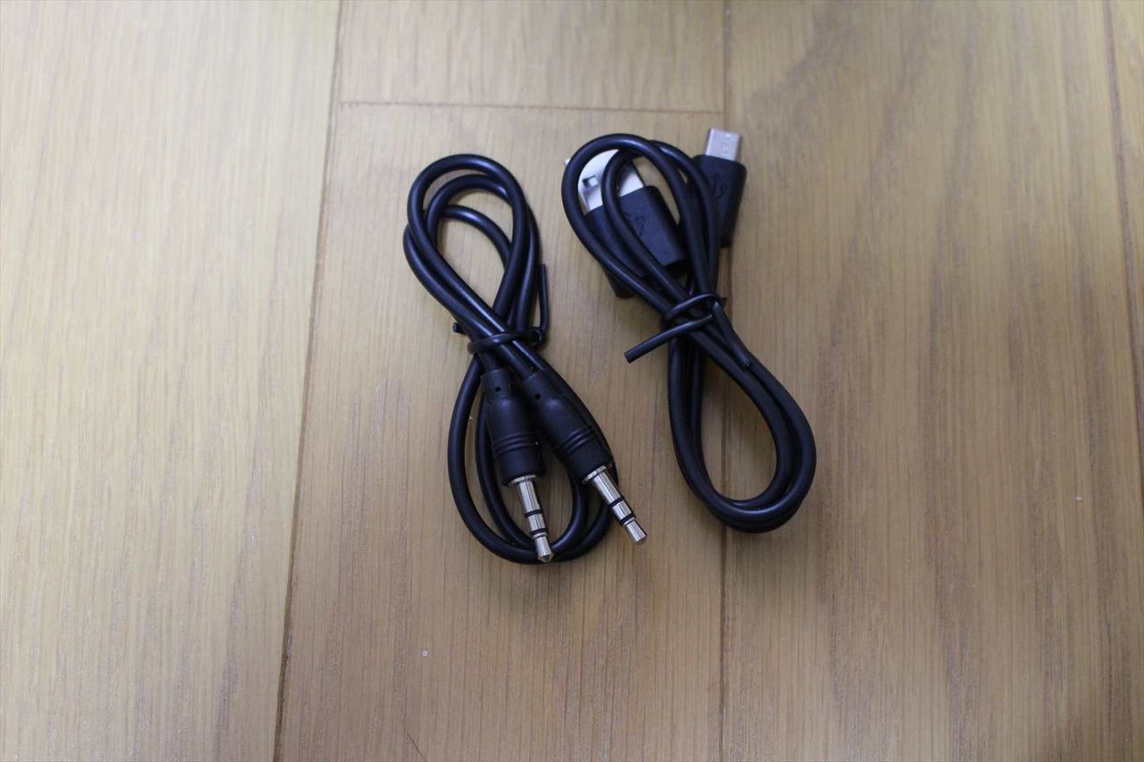 充電用のMicroUSB-USBケーブル、オーディオケーブルが付属しています。