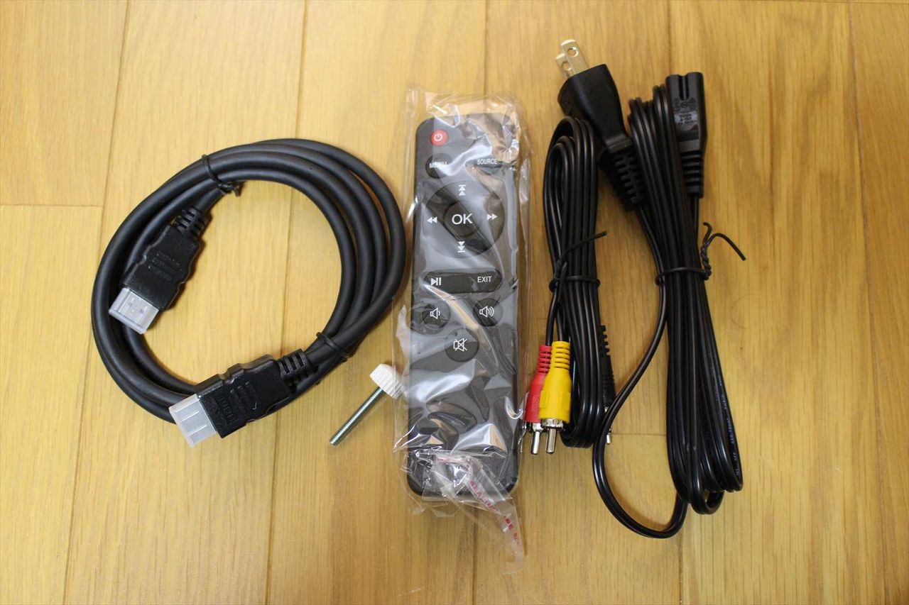 付属品は、HDMIケーブル、高さ調整用の足、リモコン、AVケーブルです。
