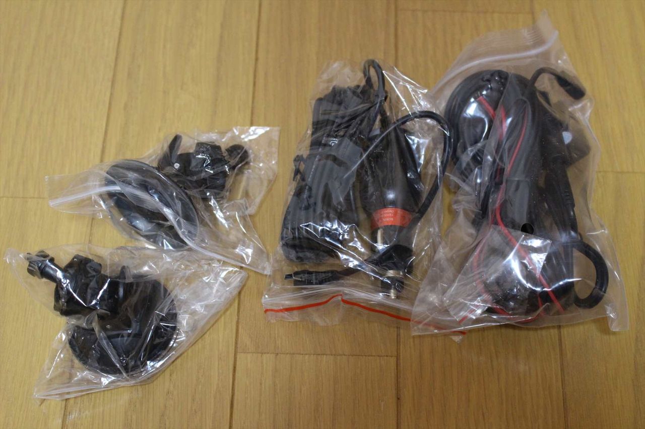 付属品は、リアカメラ、カーチャージャー、マウントが2個です。マウントは、高さの高いものと低いものの2種類です。どちらも通常の吸盤なので、ダッシュボードへの設置は無理です。フロントガラス専用と思ってください。