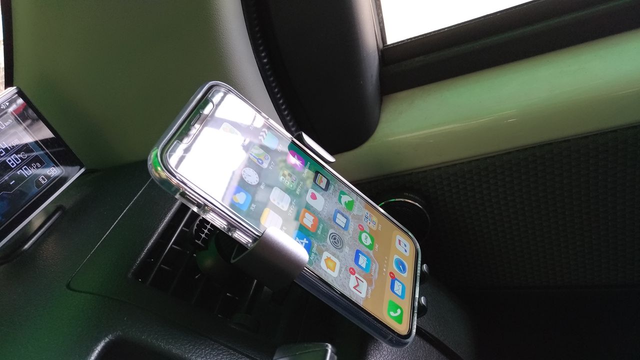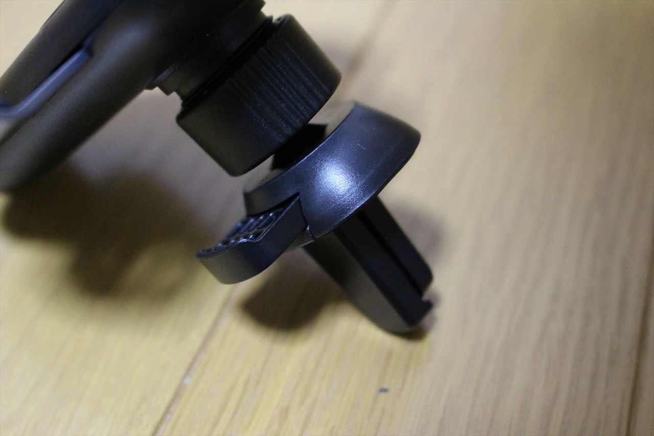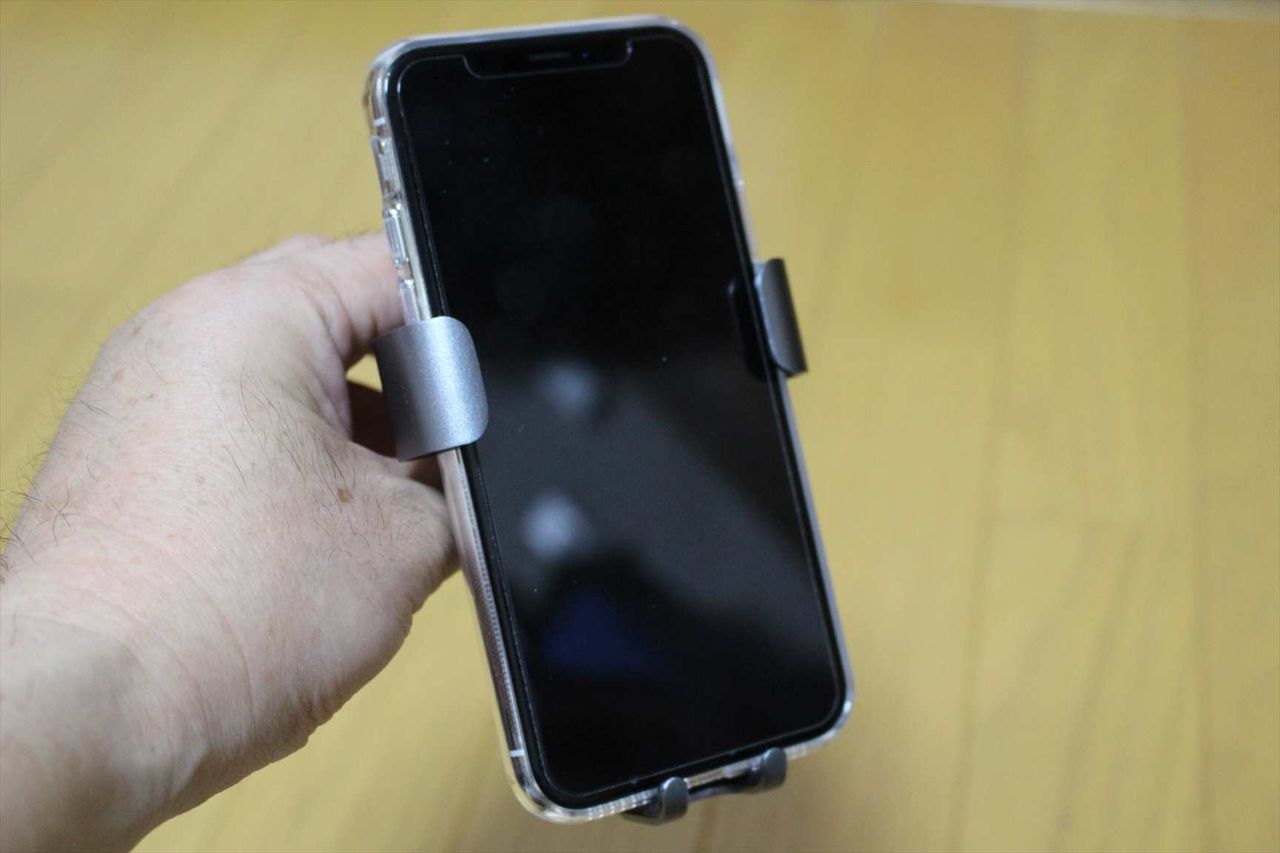 スマホをホルダーのアゴの部分に載せると、両サイドが閉じる構造になっています。