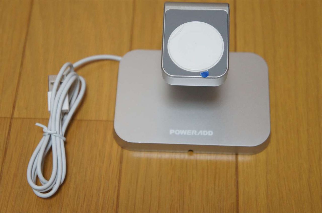 この製品には、既に充電パッドが取り付けられているので、Apple Watchを載せて、USB充電器に接続するだけです。