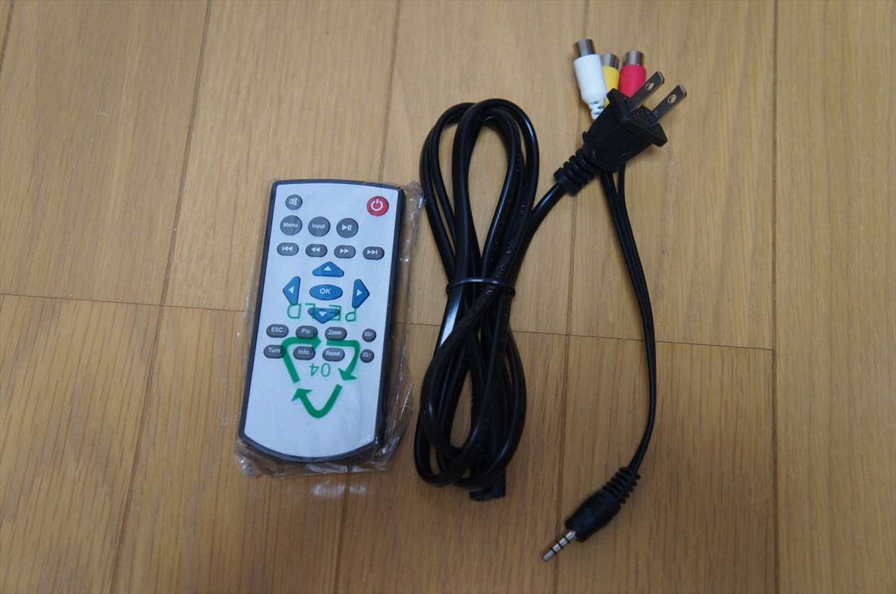 専用リモコン、電源ケーブル、AVケーブルが付属しています。